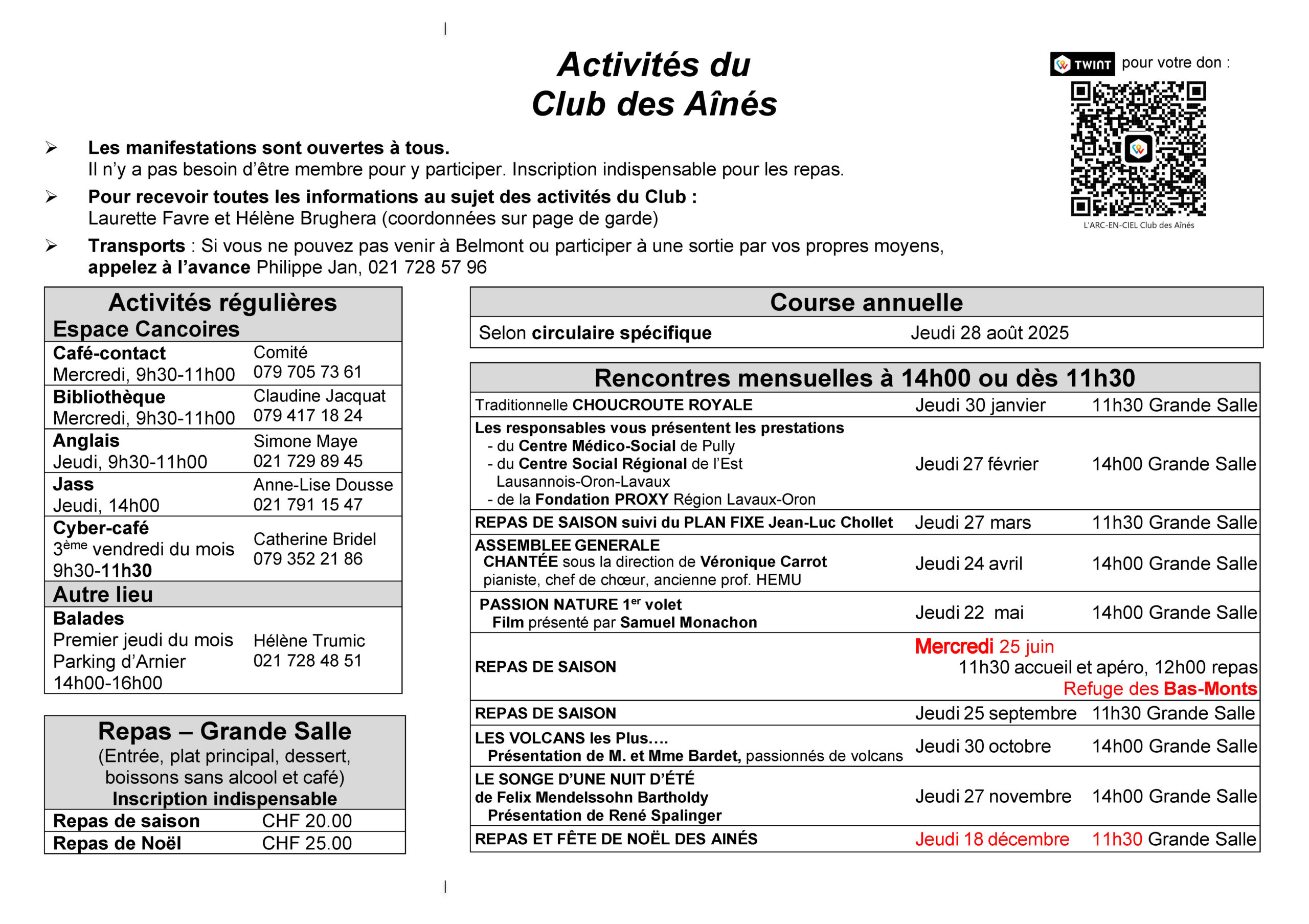 - responsable Claudine Jacquat, tél. 079 417 18 24 ouverte à toutes et tous les Cancoires et gratuit pour tous.